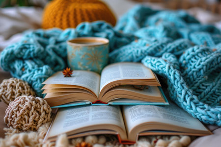 Winter Christmas top view scene with hot drink mug, opened book, knitted plaid, lights garland ans pine cones, hygge seasonal minimalistic flat lay, AI generated