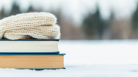 A serene winter scene featuring stacked books topped with a cozy sweater. Soft snow covers the ground, creating a peaceful atmosphere ideal for reading and relaxation.