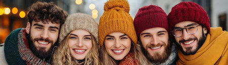 Five friends, bundled in hats and scarves, reunite joyfully in a vibrant city square Laughter echoes amidst colorful lights, blurring the winter scene Their happy, smiling faces radiate pure companionship and shared memories A perfect example of friendship, celebrating life's simple joys together AI Generative
