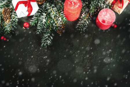 Christmas background for greeting card. Christmas tree branches with snow effect with festive red ribbon, pine cones, gift boxes and candles, on dark blue background, copy space top view