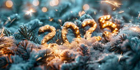 Golden 2025 illuminated with lights against a snowy background, creating a festive New Year celebration scene. High quality photo