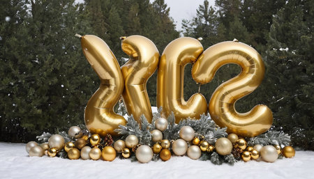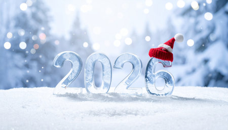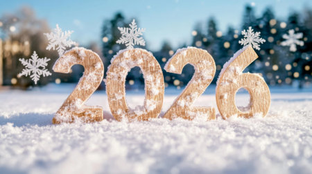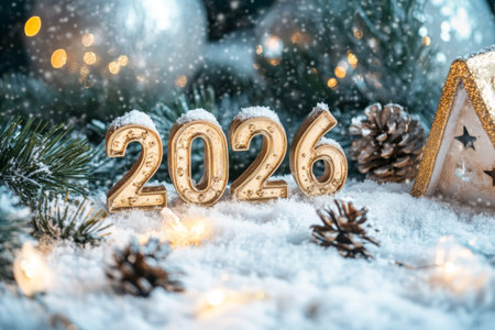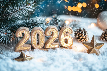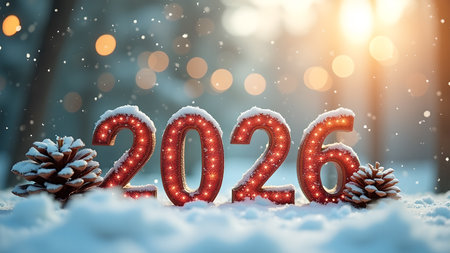A festive display of the year 2026 made of shiny numbers, surrounded by snow, pine cones, and gentle glowing lights. A winter scene filled with holiday cheer.