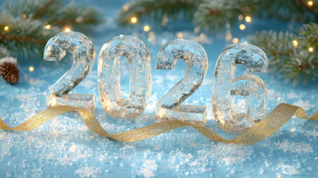 Sparkling 2026 Text with Icy Effects and Pine Cones. Concept of Festive New Year, Winter Celebration, Christmas Decor.