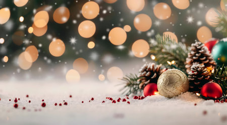 New year background with bokeh lights, for branches with pine cones and decorations in snow flakes. Christmas greeting card, banner for showing, product setting for festive promotion, place for text