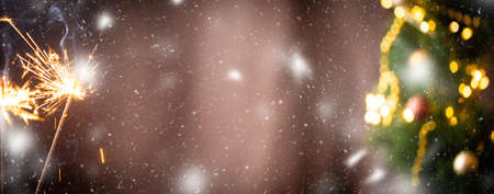 Christmas or New Year party sparkler with blurred gold lights on dark background. Festive Magic sparks lights for holiday poster, birthday or party concept. Xmas decoration