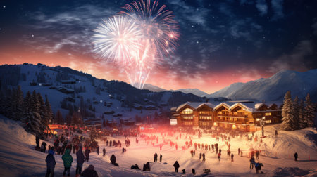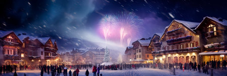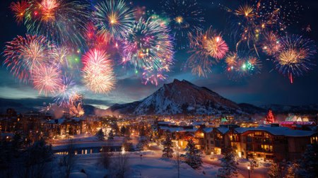 A breathtaking snowy landscape features vibrant fireworks lighting up the night sky above a mountain view, creating a festive winter celebration atmosphere in a cozy town.