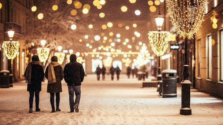 Blurred showing snowy winter street scene with glowing christmas lights and a decorated tree creating a festive...