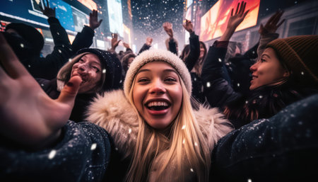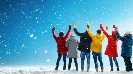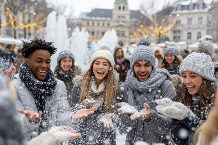 Group of diverse people smiling, celebrating, and cheering during a snowy winter festival