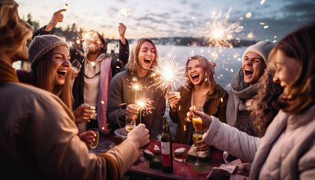 A group of cheerful friends enjoying a winter celebration while holding sparklers at night. A scene filled with snow, lights, and festive joy, perfect for holiday themes and seasonal festivities.