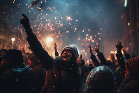 Unfocused image of a joyful crowd with raised hands enjoying a night celebration with colorful fireworks and confetti.