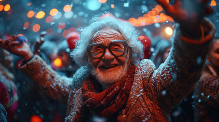 Cheerful senior man in eyeglasses and red scarf dancing with firecrackers and lights.