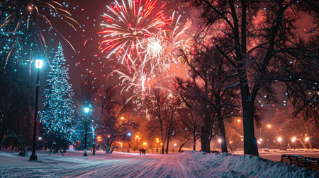 Vibrant Winter Night Fireworks Display in Snowy Park with Illuminated Trees