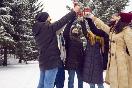 Smiling diverse young people in outerwear relax together outdoors cheers drink warm tea or coffee. Happy friends enjoy hot beverages have outside celebration during winter holidays in park.