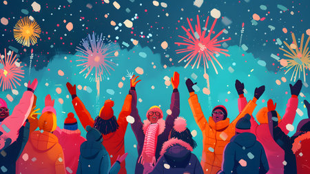 Festive crowd watches night fireworks, city street celebration, glowing lights, falling confetti.