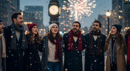 A group of happy young friends are huddled together, singing or cheering on a city street at night, with confetti falling around them. In the background, a clock tower and fireworks are visible, suggesting a New Year's Eve celebration.