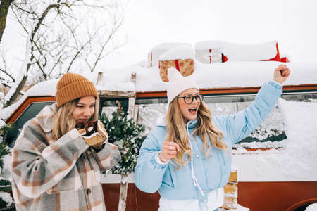 Portrait of two cheerful women friends heaving fun standing outdoor near van, enjoying winter time.
