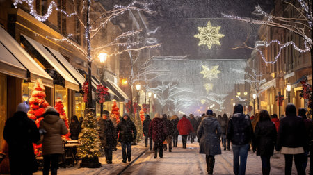 Beneath a canopy of twinkling lights, visitors wander through a vibrant holiday market. Snow blankets the ground, while festive decorations and cheerful crowds create a magical winter experience.