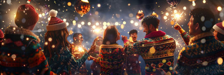 A diverse group of friends in festive sweaters holds sparklers while celebrating Christmas together, with twinkling fairy lights and colorful ornaments in the background, banner