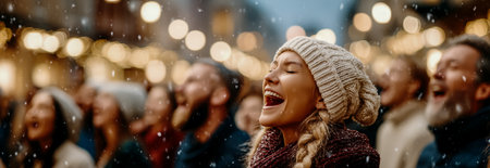A joyful woman singing in the snow while surrounded by a cheerful crowd