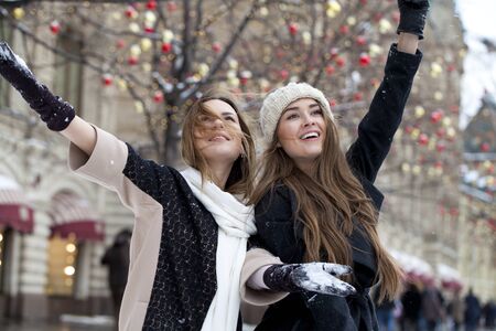 Happy girls in beautiful winter clothes make snowballs near the house, decorated for Christmas. Time of miracles. Merry Christmas and a Happy New Year.