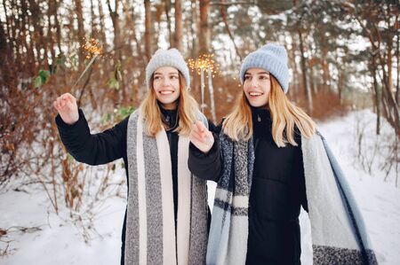 Photo of two women with Bengal lights on winter walk on background of decorated spruce
