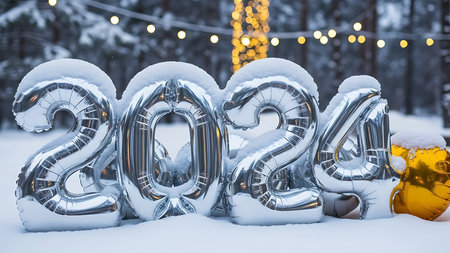 Happy New Year 2020. Silver balloons in the snow. Festive decoration.