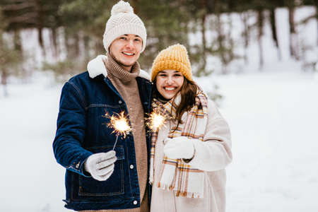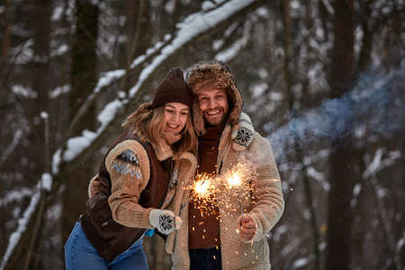 Selective focus. Couple Love Story in Snow Forest Kissing and Holding Sparklers. Couple in Winter Nature. Couple Celebrating. Valentines day date.