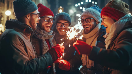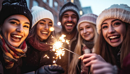 Portrait of happy friends smiling at camera standing outdoors with sparklers in their hands and having fun during winter holidays