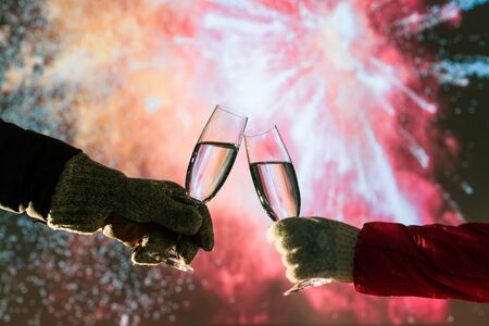 Merry man and woman in the winter clothes toasting with glasses champagne celebrate holiday christmas or new year during fireworks at night.