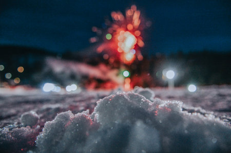 Winter Evening Celebration with Fireworks in the Snowy Park