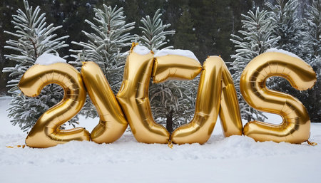 Shining 2025 inscription made from golden garland lights, holiday vibe