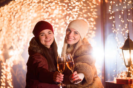 Girls enjoying champagne. Outdoor portrait of ladies on light background.
