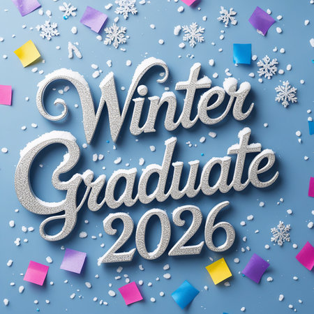 An image celebrating a winter graduate from the year 2026. The text 'Winter Graduate 2026' is prominently displayed in a glittery, silver font against a blue background. Surrounding the text are colorful confetti pieces and snowflakes, adding a festive and celebratory atmosphere to the scene.