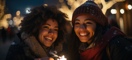 Photo of two women with Bengal lights on winter walk on background of decorated spruce