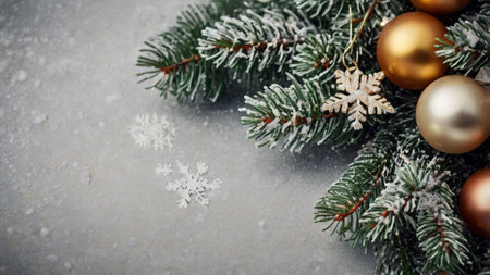 Elegant minimalist Christmas background with pine decorations and fairy lights.