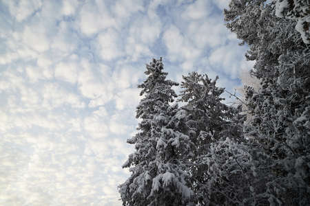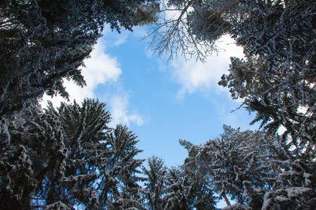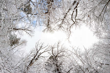 Bottom view of trees covered with snow in beautiful winter woods and sunlight