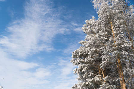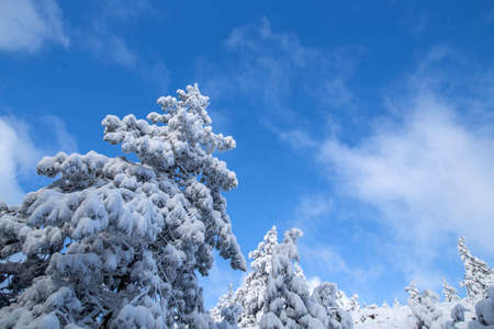 Winter background. On a beautiful winter day, snow-covered trees against the blue sky.