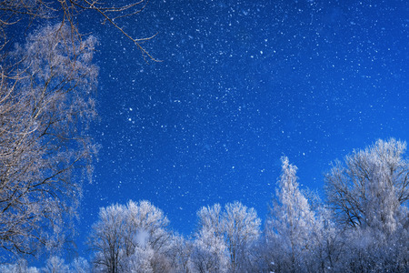 Dark winter landscape. Trees with hoarfrost, falling snow and blue sky. Evening, copy space on the sky