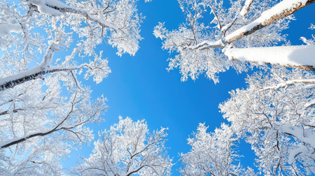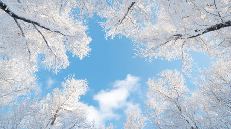 Snow-covered tree limbs stretch into a serene blue sky, setting the perfect tone for holiday cards or winter-themed designs.