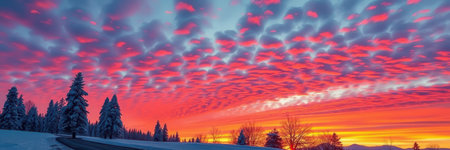 Snow-laden evergreen trees and a large bare tree stand at the edge of a snowy clearing under a vibrant sunset sky.