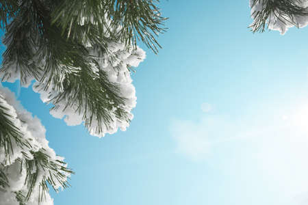 Bottom view of the blue sky and the tops of pine trees in the snow. winter view.