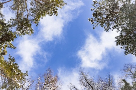 Bare tree branches and dark evergreens frame a vivid blue sky with scattered white clouds in a winter forest scene