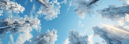 Looking Up at Frosty Trees and a Clear Blue Sky, Winter Wonderland Scene with Snow Covered Branches