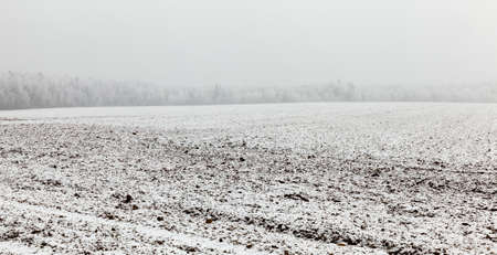 Plowed agricultural field covered with white snow, in the background trees covered with white rime in the forest