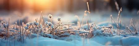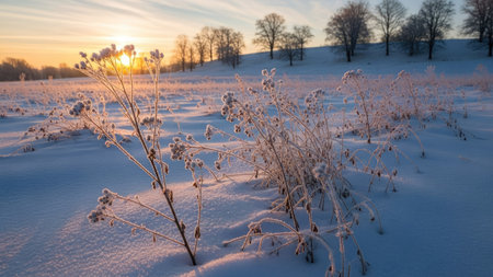 Frosty plants in a snowy field at sunrise. Serene winter landscape.