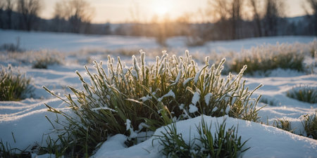 Frosty grass glistens in the early morning sunlight at a serene winter landscape