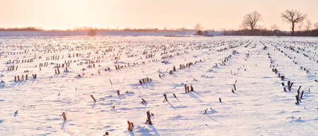 Winter landscape with the sun setting over the horizon. The sun's rays are reflected in the white snow in the cornfield.