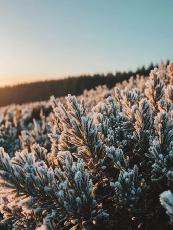 A breathtaking scene of frost-coated plants illuminated by warm winter sunlight, capturing the beauty and tranquility of a frosty morning in nature.