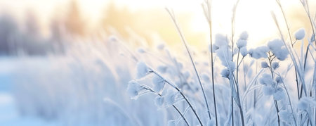 Close-up view of frost-covered plants in a winter field. Serenity and peace.