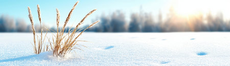 This serene winter landscape features tall grass peeking through fresh snow under bright sunlight. The tranquil scene captures the beauty of nature in the cold season.